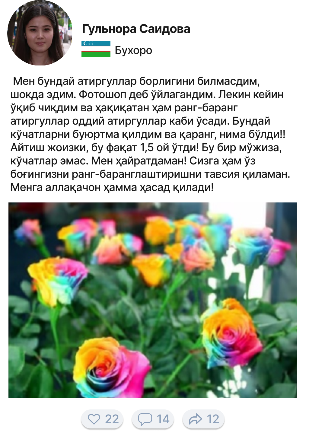 Биз кўчатларни яратишнинг батафсил технологиясини сир тутамиз. Aммо, умуман олганда, бу жуда нозик ва мураккаб иш деб айта оламан. Ҳар бир дастани тўғри кесиб олишингиз керак, у йерда махсус бўёқ қўшасиз ва кутасиз. Мен ҳамкасбларим билан 4 йил давомида мукаммал камалак рангларидаги атиргул кўчатларини яратиш учун тажриба ўтказдик. Ва енди биз барчага боғнинг ҳақиқий безагига айланадиган бундай ноодатий атиргулларни йетиштириш учун ноёб имконият берамиз!